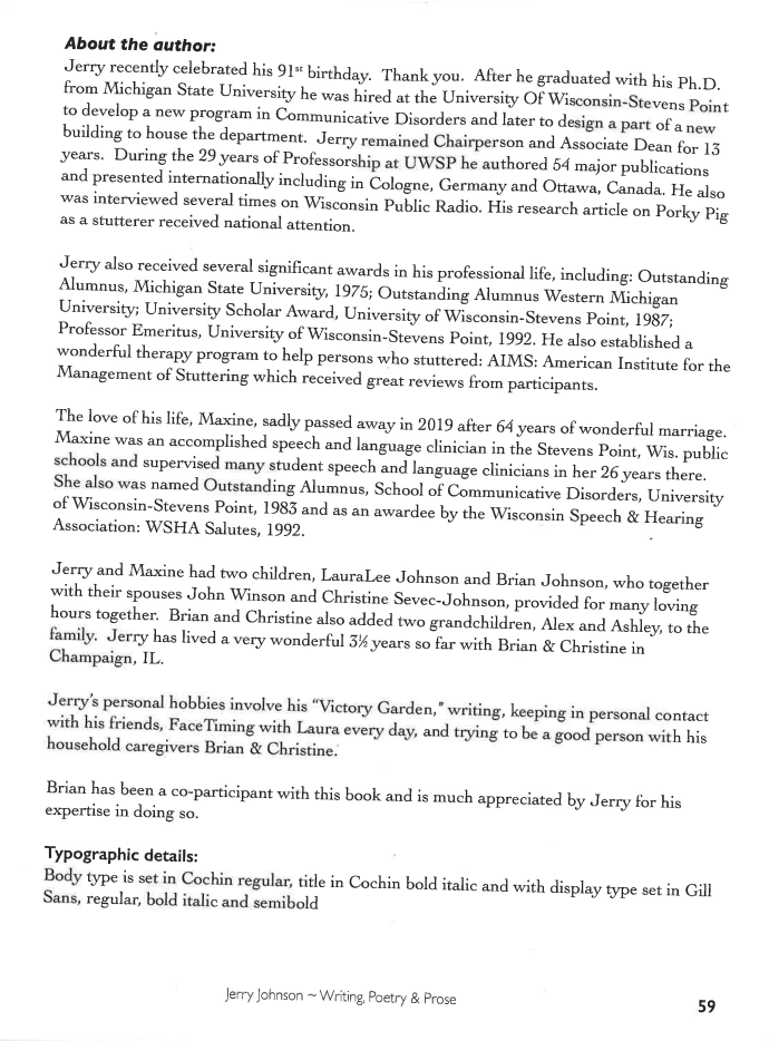 Jerry Johnson '50 wrote Writing, Poetry & Prose, available online. Here is his bio from the book: